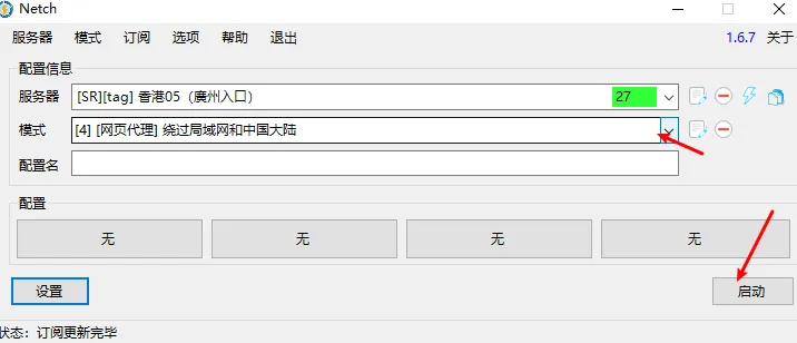 这里选择“绕过局域网和中国大陆”就是当科学上网代理工具使用了。然后点击启动