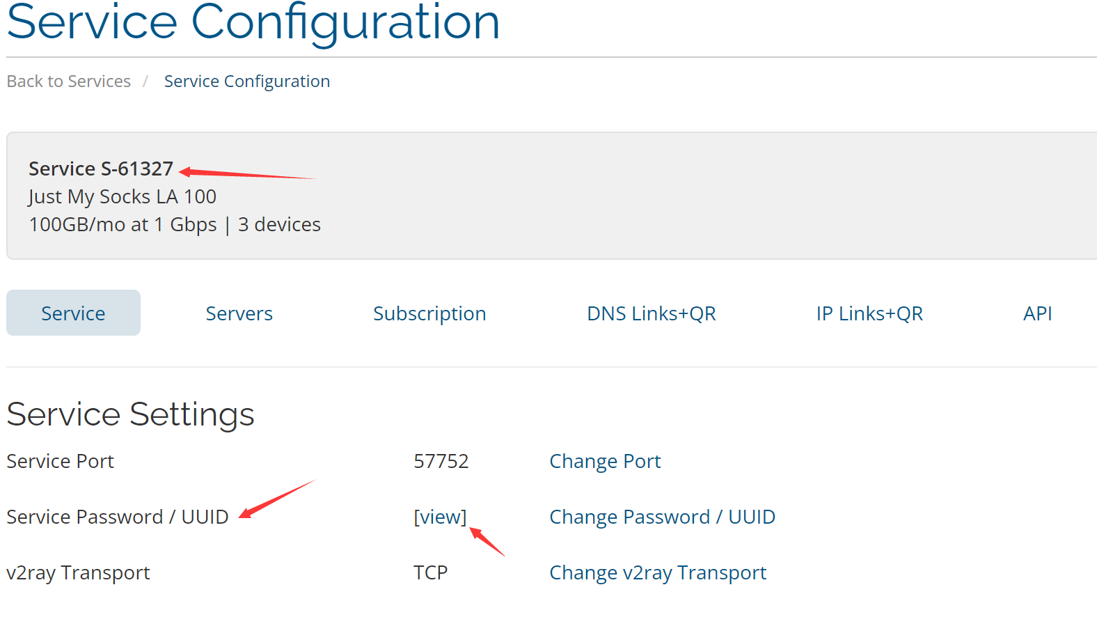 UUID: 就是Service Password / UUID右边"views"里面的"V2ray UUID"右边的字符串,也可以在"servers"找到"V2ray UUID".