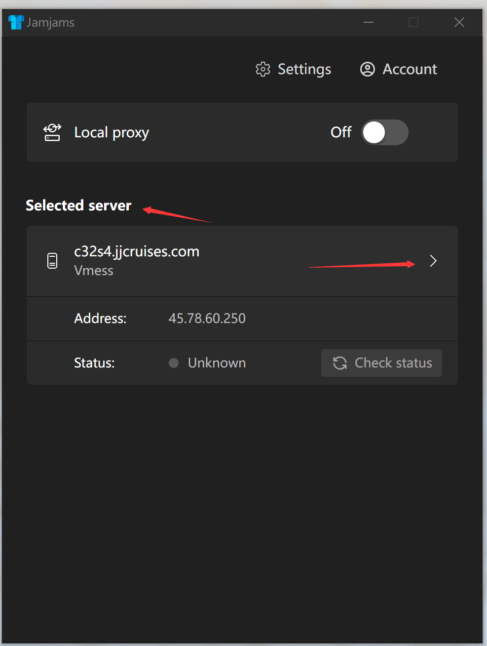 当你点击"Log in"之后jamjams-0.1.8客户端软件会显示你just my socks账号链接信息(Selected server).点击右边的">"在里面选择一条可用线路.一般是s3,s4.如果没有可用线路请刷新线路.